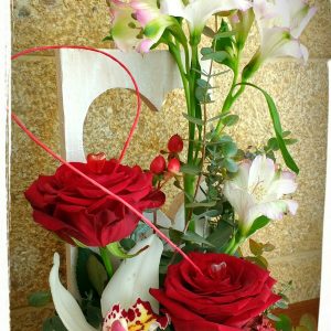 Ελεύθερο μπουκέτο με τριαντάφυλλα, αλστρομέριες και φυλλώματα